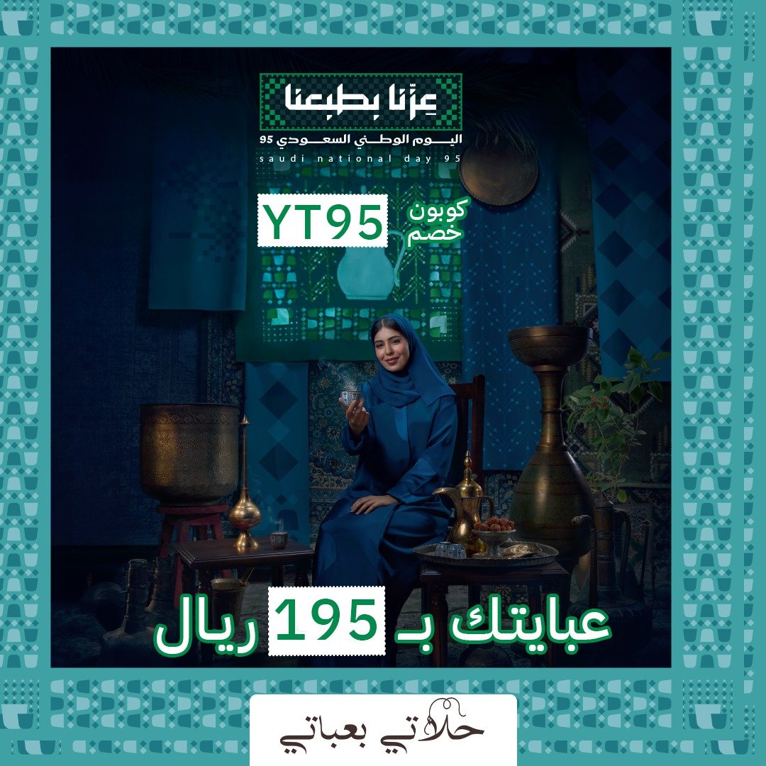 ادخلي الآن على موقعنا الإلكتروني أو تطبيقنا، واختاري العباية التي تعجبكِ، وأدخلي كود "YT95" عند الدفع لتستمتعي بهذا العرض الاستثنائي. احتفلي بيومكِ الوطني بأناقة تليق بوطنكِ الحبيب، واجعلي إطلالتكِ تعبر عن فخركِ وانتمائكِ لهذه الأرض المباركة.