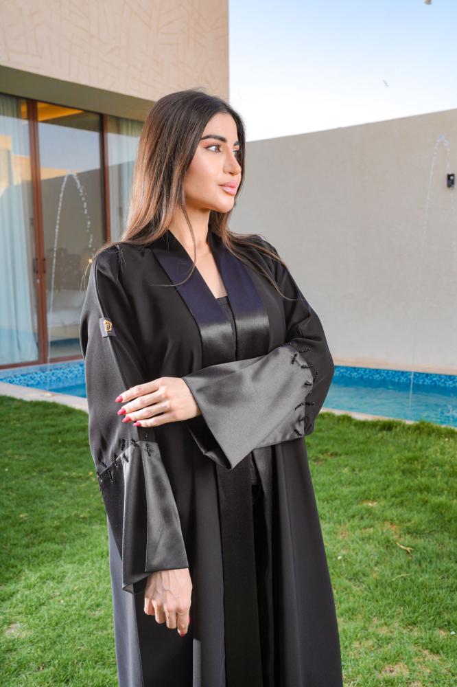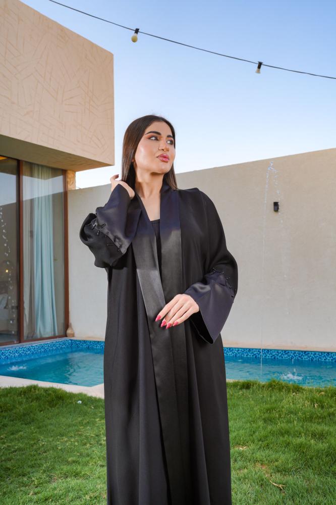 عباية بتصميم عصري، قماش ملكي ناعم وخفيف، ولمسة ساتان تضيف فخامة وأناقة تناسب ذوقك الرفيع.